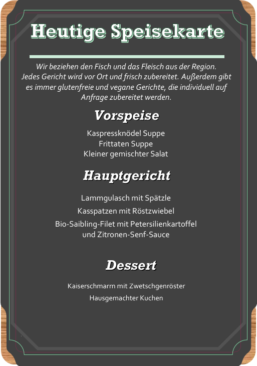 Während der Öffnungszeiten bieten wir eine warme Küche mit regionalen und saisonalen Produkten an.